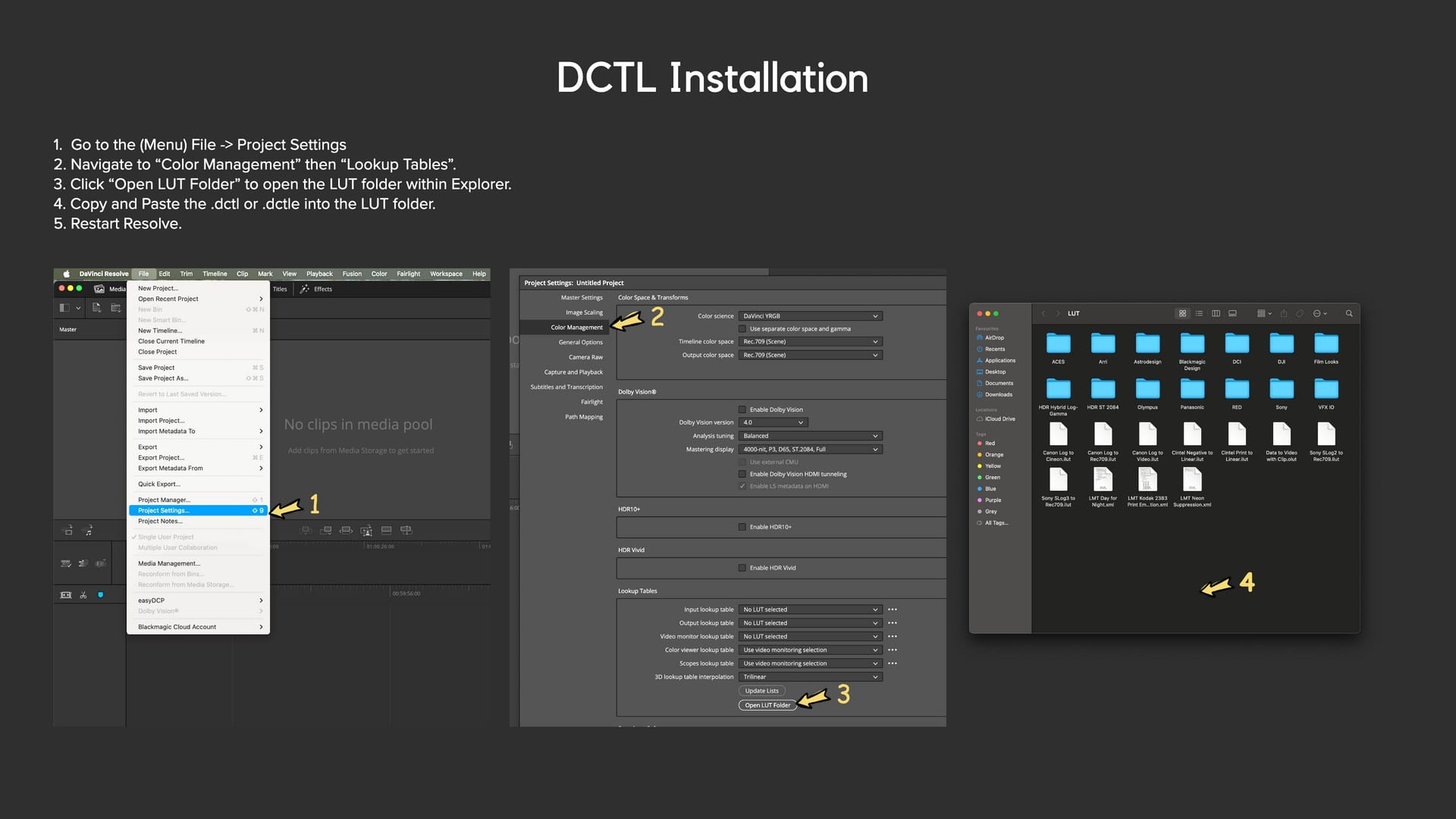 - Install Correctly: Place downloaded DCTLs in the appropriate LUT directory for your operating system: